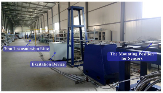 A conductor galloping experiment was carried out on a transmission line model, provided by the State Grid Key Laboratory of Power Overhead Transmission Line Galloping (Zhengzhou, China). As shown in the Figure 9, the total length of the conductor model installed on the experiment platform is 70 m. The excitation device generates an external force that causes the conductor to galloping, and the galloping frequency can be adjusted at multiple frequencies, such as 0.5 Hz, 1.03 Hz.