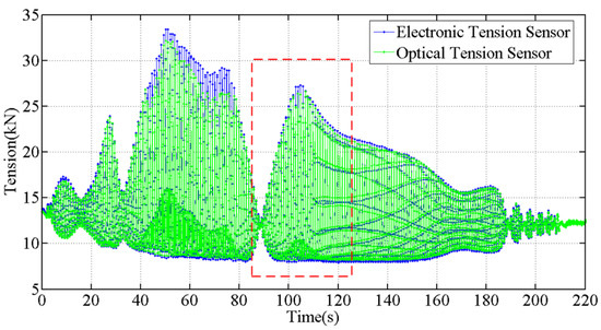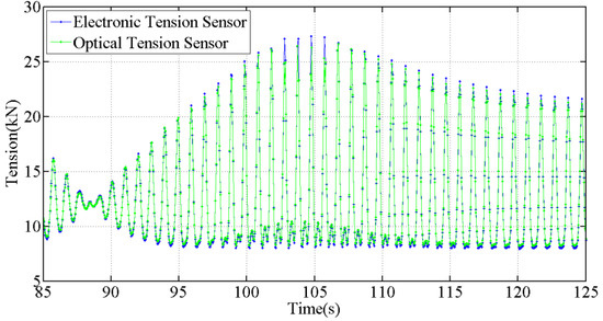 During the experiment, the horizontal dynamic tensions produced by the transmission line model galloping were recorded by an electronic tension sensor and the optical tension sensor. We installed the optical tension sensor at one end of the transmission line model, which was connected in series with the electronic tension sensor, which are illustrated in Figure 10. The sampling frequency in the experiment was set to 20 Hz.