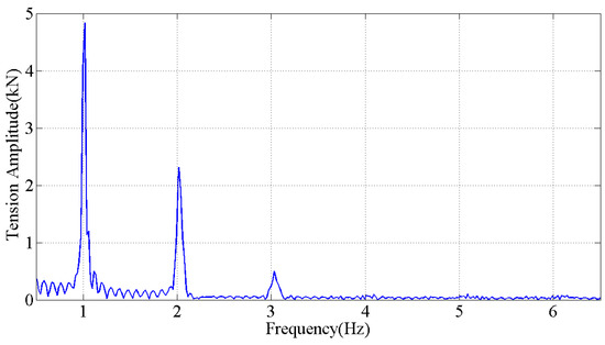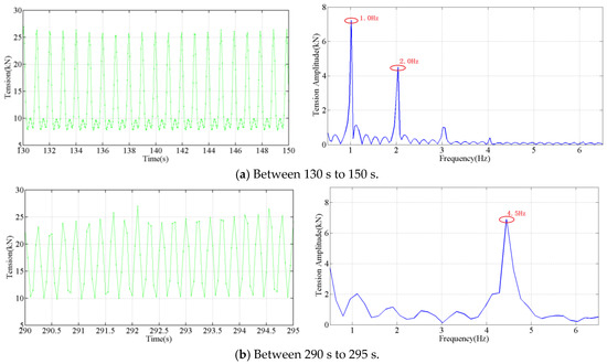 Zoomed tensions and their amplitude spectrums are illustrated in the Figure 15. Between 130 s to 150 s, the force measured and its amplitude spectrum are shown in Figure 15a. There are two dominant oscillation frequencies, 1 Hz and 2 Hz, in the measured amplitude spectrum of the tension, and one oscillation frequency (2 Hz) is twice the frequency of the other (1 Hz). According to the analysis before, it is a one loop galloping, n = 1.