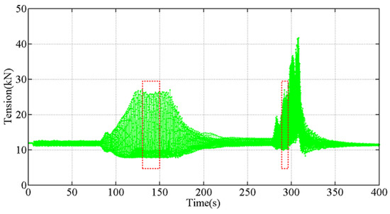 The tension measured during the galloping (frequency is 1.02 Hz), the curve in the red dashed box is shown in Figure 12.