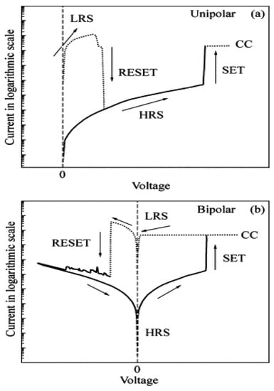 I-V curves of: (a) unipolar switching; and (b) bipolar switching [16] (with permission from Elsevier).