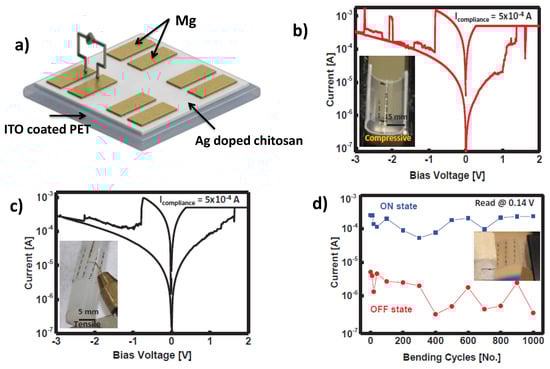 (a) Pictorial representation of the Mg/Ag doped Chitosan/Mg-RSD. Resistive switching behavior of the device after bending with a radius of curvature of 5 mm under: (b) Compressive stress; and (c) tensile stress. (d) Cyclic test performed at 0.14 V read voltage showing the stability of the RSD in its bend state [44] (with permission from Advanced Functional Materials).