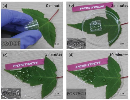 It was also found that, by replacing the substrate with chitosan, and by using Mg as electrodes, the device could be completely decomposed. The Mg electrodes decomposed by reacting with water while the chitosan substrate also vanished by absorbing water (Figure 3a–d).