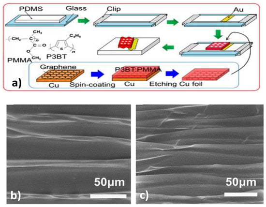 (a) Schematic representation of the Fabrication process for the stretchable organic memory devices, along with the chemical structures of PMMA and P3BT. PDMS; (b) SEM image of top view of rippled organic memory film; and (c) SEM image of angled view of rippled organic memory film [60] (with permission from Nature Publishing Group).