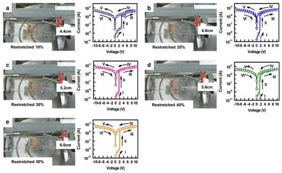 (a–e) Electrical switching characteristics on the RSD under different stretching condition (10% to 50%) [60] (with permission from Nature Publishing Group).