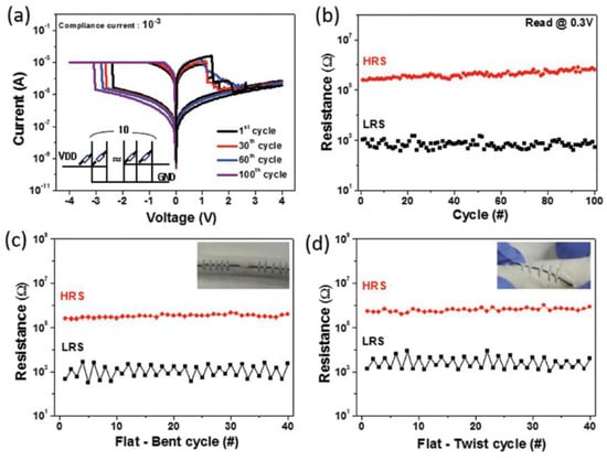 Hosseini et al. [42] came up with flexible coplanar RSDs showing promising non-volatile memory applications. The major advantage of this RSD other than its flexibility is that it is a biocompatible device. Recent research has been carried out in the field of biodegradable electronics which can be implanted into human body and then be bio-adsorbed [43,44,45,46,47]. Here, a coplanar structure was designed using Mg electrodes and the switching matrix was fabricated by Ag-doped chitosan. Figure 2a gives the pictorial representation of the RSD. Mg has the outstanding properties of biodegradability and electrical conductivity. Chitosan on the other hand is an edible natural material [48,49]. The Ag-doped RSD exhibited non-volatile switching, which can be attributed to trap-related space-charge-limited conduction in high resistance state and filamentary conduction in low resistance state [15,50,51,52]. Bendability and performance under tensile and compressive stresses were evaluated. The IV features of the device under compressive and tensile stress are given in Figure 2b,c. The device was bent under the extremely small radius of 5 mm. The device maintained a stable On and Off current for consecutive 1000 cycles at a read voltage of 0.14 V, on mechanical flexibility tests with 5 mm radius of curvature (Figure 2d).