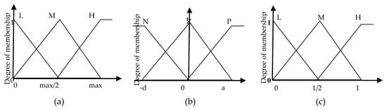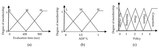 Selecting policy based on simple logic with threshold values is not preferred with estimated measurements. Because of that, another proposed logic is considered here. Beside the major measurement of delay time, evaluation time should be take into consideration. Evaluation time is the time required to evaluate each policy. Most of the standards manuals, e.g., [15], typically used 15–20 min to evaluate TSC. This value may not be reached with low PR, though our fuzzy TSC will considered the evaluation time as the second input beside accumulated delay percent . The possible fuzzy sets for the evaluation time are L for low, M for medium and H for high. For the , the defined fuzzy sets are also L for low, M for medium and H for high. In addition, output fuzzy sets corresponding to policy output have also been defined as no-change, marching, phase, platoon and congestion. The membership functions used in our TSC, based on simple rating system, are illustrated in Figure 2a–c.