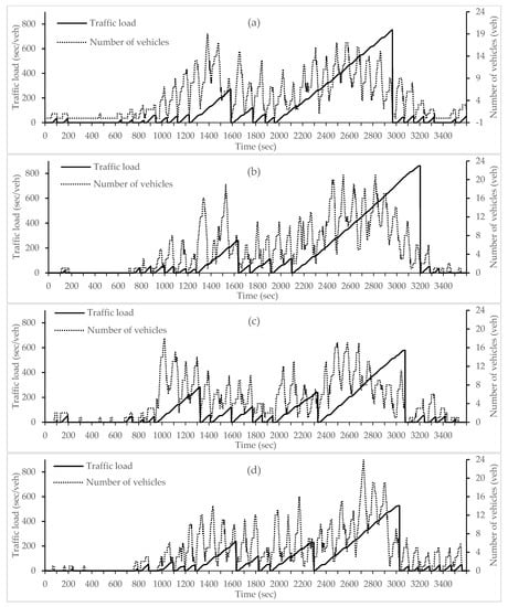 Traffic load with number of vehicles per incoming edge (a) 180°, (b) 90°, (c) 0° and (d) −90° direction respectively.