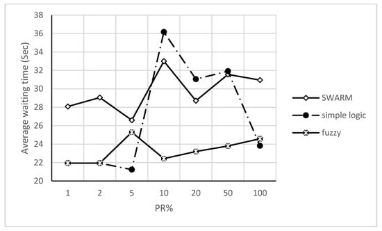 Platoon policy gets significant results at low-medium PR (i.e., 2–20%) and minimum values at medium PR (i.e., 50%). As long as nothing blocks the vehicles after passing the central area, this policy creates platoons of vehicles that are free for leaving the intersection. Creating a platoon requires some characteristics, such as platoon size, length and period, to be available to study their behavior. Such characteristics are difficult to study especially under PPR approach for TSC adaptive problem. The above results clearly indicate that PPR approach should be handled under specific policies. Best TSC approach should be able to properly detect each policy situation and Figure 8 shows all of them under different PR. Swarm algorithm (more specifically, policy selection procedure of it) select between the above policies with dynamic mechanism. This mechanism depends on parameters optimization that provide smooth transitions between policies. In spite of that, this transition has a clear oscillation effect with PR > 10%. In other words, swarm algorithm has an optimization solution with unstable transition effect rather than direct policy selection procedure. On the other hand, using simple and direct if-then rules (with fuzzy delay estimation) give the same behavior as for individual policies based on threshold values for policy selection procedure. Both of the above policy selection procedures give comparable results with different PR except at 10%.