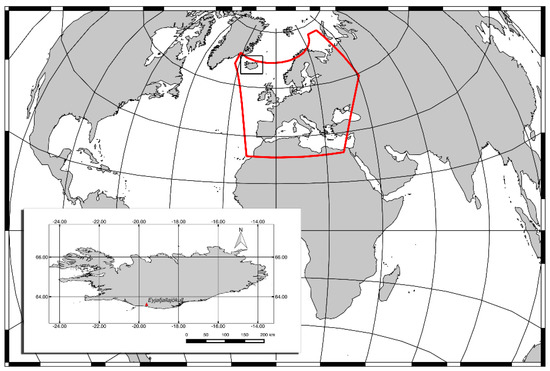 Geographic Earth map in azimuthal equidistant projection. The region investigated in this work is highlighted by the red polygon; the location of Eyjafjallajokull volcano is indicated within the panel at the bottom-left of the image.