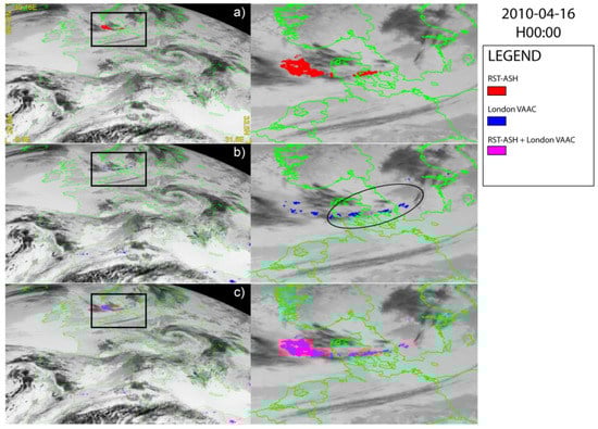 In particular, Figure 2 displays the ash maps of 16 April at 00:00 UTC, with the RSTASH product displayed on the top (Figure 2a) and the London VAAC ash map shown in the middle (Figure 2b). As can we see, both methods detected an ash plume affecting part of the North Sea and moving east toward Denmark (see red and blue pixels within the black square magnified area on the right side of the same figure). Nevertheless, according to RSTASH the ash covered a larger area over the sea than the London VAAC method (see Figure 2a), although the latter indicated that the volcanic plume was more elongated in the north-east direction (see pixels within the ellipse in Figure 2b; right side of the figure). Combining the maps provided by those independent ash-detection methods produces the ash plume shown in Figure 2c, which seems to have a more plausible spatial continuity of the ash-affected areas.