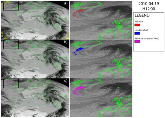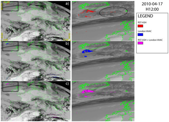 Spinning enhanced visible and infrared imager (SEVIRI) ash maps of 16 April 2010 at 00:00 UTC over-plotted on the SEVIRI channel IR 10.8 µm; (a) RSTASH; (b) London VAAC; (c) combined algorithms. On the right side of each panel the zoom of detected plume is shown.