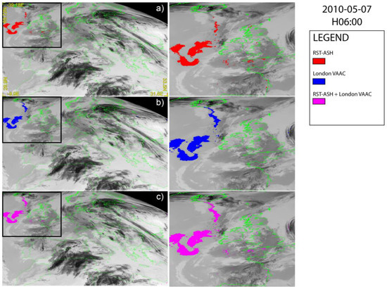 SEVIRI ash maps of 7 May 2010 at 06:00 UTC over-plotted on the SEVIRI channel IR 10.8 µm; (a) RSTASH; (b) London VAAC; (c) combined algorithms. On the right side of each panel the zoom of detected plume is shown.