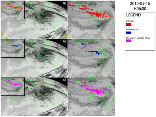 Figure 6 displays the results for 16 May at 06:00 UTC showing that an ash cloud dispersing in the NW–SE direction affected the analyzed satellite scene. However, according to RSTASH (Figure 6a) the ash plume was more extended than that indicated by the London VAAC (Figure 6b), which missed a number of ash pixels within the ellipse (Figure 6a), where the ash presence was confirmed by some independent satellite-based products [56]. Therefore, also in this circumstance, the combination of two algorithms (Figure 6c) did not significantly improve the results of ash detection from space (see Figure 6a for comparison).