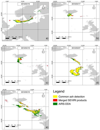 Table 4 quantifies results of this investigation showing that the ash plume dispersed over a wider area during the last phase of the eruption (see maps of 7 and 16 May). Nevertheless, the area retrieved from AIRS DDA maps was always higher than that estimated from the merged SEVIRI product, revealing a different sensitivity to volcanic ash. In more detail, the table shows that the maximum value of the common ash-affected area (CA) was retrieved on 7 May when, despite some differences characterizing especially the proximal portion of the plume where it seems that the DDA performed better (see green area in Figure 7), results from SEVIRI and AIRS data were quite similar. On the other hand, the same panel reveals a slight spatial shift of the ash-affected area (see plume edges also on panels of 16 April and 16 May), which can be ascribed to residual geometric effects (e.g., parallax error) and/or to the minor temporal difference between AIRS and SEVIRI acquisitions (see Table 3). Regarding the minimum CA value in Table 4, it refers to maps of 17 and 19 April (see yellow areas on relative panels in Figure 7), when most of ash plume affected the sea region located close to Iceland.