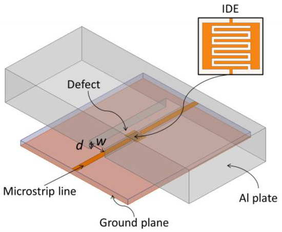 In order to prove the IDE filter can detect surface damage in metals, we designed an IDE microstrip band-stop filter that is perpendicular to an aluminum plate with notch-type damage in ANSYS HFSS software, as shown in Figure 1. A thin Teflon film with a thickness of 0.05 mm is laid on the aluminum surface before the defect under film being scanned, where w and d are the width and depth of the defect, respectively. The filter adopts a rectangular IDE structure in the middle of the microstrip line, which makes it operate around 6 GHz. To achieve this goal, one can use the approximate model described in [26].