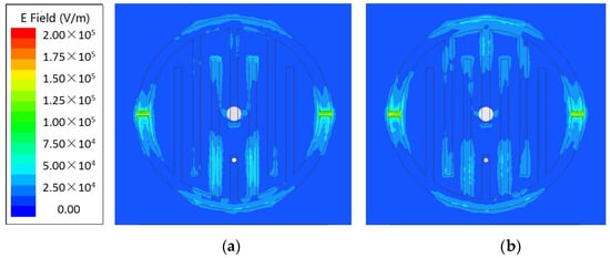 Electric field distributions on the surface of the PCB patch for different metallic surfaces, where the working frequency is 13.78 GHz. (a) Aluminum surface with defect; (b) Aluminum surface without defect.