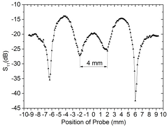 Figure 9 shows the experimental results of scanning the aluminum plate with long notch-type damage. The width and depth are 4 mm and 0.4 mm respectively, and the defect locates at 0 mm. According to Figure 9, there is a symmetry change in magnitude relative to the position of the notch-type damage at 13.86 GHz when the defect is encountered. The distance between the two troughs in the middle is close to the real value of the width.