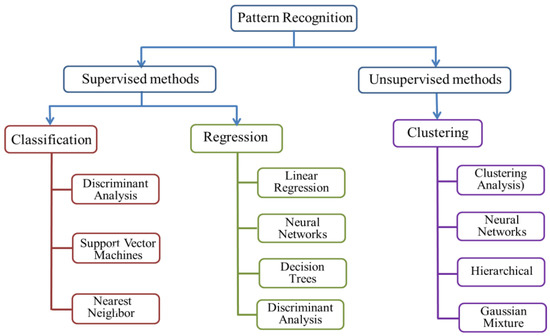Data analyses using algorithms are used to perform qualitative classifications and quantitative predictions. There have been significant improvements in pattern recognition technologies, and many advanced algorithms have been introduced for E-nose systems. Two classes of statistical methods are generally used, as shown in Figure 3 The first, supervised methods, include artificial neutral networks (ANN), and are used to classify unknown features of a class that have the most common properties based on prior knowledge or probability distributions from training samples [74]. The other group is unsupervised methods, such as cluster analysis (CA), which separate the input data into different clusters based on feature similarity [75]. To provide a general overview for applications in plant health determination, the sections below review the four most common approaches: cluster analysis (CA), ANN and random forest (RF).