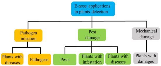 Plant VOCs play significant roles in responding to pest attacks and are promising targets for pest detection. The composition of VOCs emitted by plants depends on the mode of damage. Biologically, VOCs are produced by a wide range of physiological processes in many different parts of plant tissues. The defense mechanisms to pathogens or viruses are still unclear, but the VOCs have been found to change after plants are infected. Plants require a broad range of defense mechanisms to effectively combat attacks by herbivorous insects or mechanical damage [30]. One of the strategies is to emit specific VOCs to battle potential attacks. While some protective VOCs are emitted at all times, others are induced only in response to herbivore feeding [84]. Accordingly, theses variations of VOCs provide reliable principles of pest detection via E-nose, as shown in Figure 4. Discussed below are advances of using E-noses in detecting fungal and bacterial infections and insect infestations in plants. The discrimination of damaged plants caused by mechanical damage is also discussed, as it is considered as background noise for VOCs detection of insect damage.
