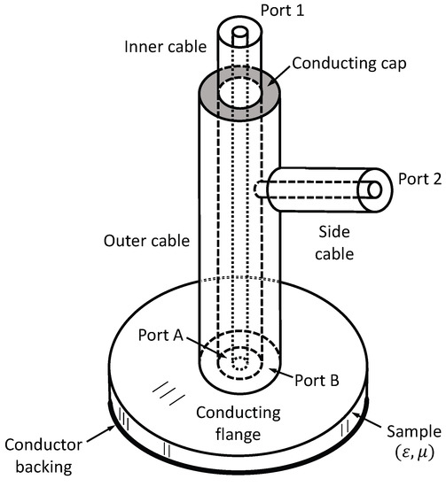 Because the electromagnetic properties of the materials degrade with age and exposure to the environment, it is important to regularly verify their performance without removing them from the aircraft. This requires non-destructive techniques to measure the complex permittivity and complex permeability of these microwave absorbers in situ. Because two properties are desired, two sufficiently different complex measurements must be made. However, when a material’s coating is directly adhered to an aircraft’s surface, the presence of the conductor backing prevents the measurement of a directly transmitted wave, and reflection/transmission techniques such as those presented in [4,5] cannot be used. Specialized techniques that use knowledge of the material’s constituency are possible [11], but usually two different reflection measurements are employed [12]. Unfortunately, the restrictions imposed by in situ measurements exclude such otherwise useful techniques as the layer-shift method [13] and the two-thickness method [14], while free-space techniques that depend on varying the angle or polarization are generally unreliable [12]. Similarly, techniques that rely on a single open-ended probe [15,16,17,18] have not proven to be sufficiently robust.