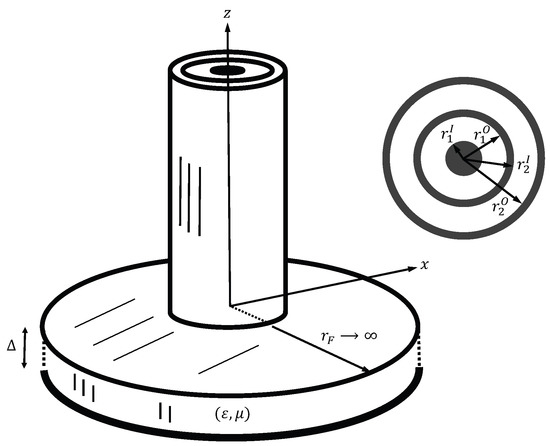 The incident TEMz wave will also generate higher-order TMz modes in each coaxial cable. Thus, the transverse fields in cable i () can be written as a modal expansion, and the modal amplitudes may be obtained by solving a magnetic-field integral equation (MFIE) formulated by applying continuity of the transverse fields at the material’s plane (z = 0). A detailed description of the solution to the theoretical problem is given in [22] and is not repeated here for the sake of brevity.
