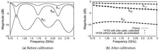 Figure 5a,b show magnitudes of the simulated S-parameters for the triaxial system before and after calibration was employed, respectively. We note that the S-parameters were relative to the true port impedances at Ports 1 and 2. The S-parameters could be renormalized to 50 if desired using the method in [25], but as mentioned earlier, issues regarding mismatches at the ports were handled by the calibration procedure. Thus, the S-parameters after calibration were relative to the true port impedances even if measured using a 50 system. The oscillations visible in each S-parameter were primarily due to standing waves established between the side-cable transition and the measurement plane and were eliminated upon calibration. We note that the transmission coefficient varied between about and dB across the measurement band, and thus even before calibration there was significant transmission between the ports and through the sample.