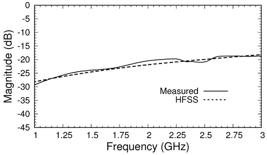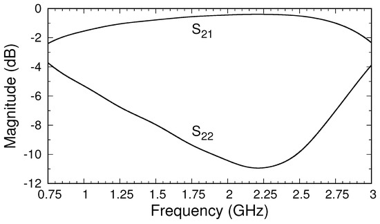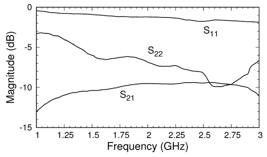 The calibration of the triaxial system was accomplished using brass short circuits of lengths 0, , and mm. The negative lengths indicate that the shorts extended into the triaxial structure by these distances and corresponded to electrical lengths of 0, , and at 3 GHz, the highest frequency in the band of interest. Employing the calibration routine described in Section 4, the system’s S-parameters for the transition regions were first found. Those for transition A, representing the center coax, correct for the phase shift and slight attenuation of the center cable. The S-parameters of transition B correct for the imperfect transmission from Port 2 to Port B and include the effects of reflections and higher-order mode generation at the connection of the center conductor of the side cable and the inner conductor of the outer cable. Figure 6 shows the magnitude of the S-parameters of transition B. The choice of position of the side cable relative to the top of the outer cable was made by examining the S-parameters of transition B for several possible placements. The decision to use a position of 40 mm was based on making as large and uniform as possible across the operating band of 0.75–3 GHz. The result was a transition with dB across the band.