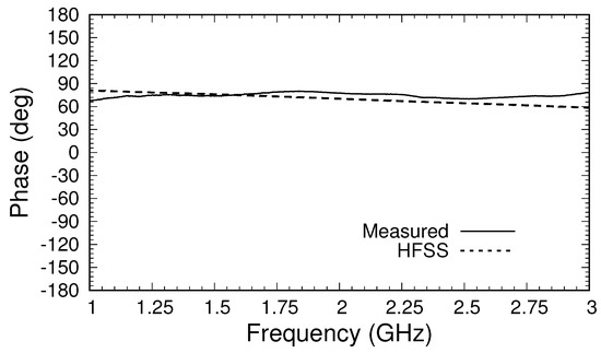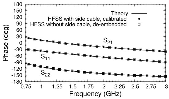 The magnitudes of the S-parameters after calibration, shown in Figure 5b, are compared to those found using the theoretical approach described in [22], which produces S-parameters directly at the material’s plane (Ports A and B). Because the theoretical model uses an expansion of the fields in terms of coaxial cable modes, a choice of the number of modes to use must be made. To obtain the results shown, the S-parameters were computed using 5, 10, and 20 modes, and the results were extrapolated quadratically to an infinite number of modes [26]. A comparison between the S-parameters from the HFSS after calibration and those obtained from theory is excellent, particularly because the theoretical model assumes the flange and sample are of infinite extent and that the flange and conductor backing are perfect electric conductors. As a further test of the accuracy of the calibrated values, HFSS simulations of the simple model of the triaxial system shown in Figure 2 were made. The S-parameters were computed at the inputs to the inner and outer cables, and the de-embedding function in the HFSS was used to transfer the S-parameters to Ports A and B (at the material’s plane). The results, shown in Figure 5b, are very close to those found using the three-short calibration method with the full triaxial system but are not an exact match. The difference is attributed to inaccuracies in the HFSS calculations and to the possible existence of higher-order modes of very small but nonzero amplitudes at the measurement ports. In any case, the results do support using the three-short method to calibrate measured data from the triaxial system, suggesting that these results should match the theory well enough to provide robust data for material characterization. Comparison of the phases from the three approaches, shown in Figure 7, supports this conclusion.