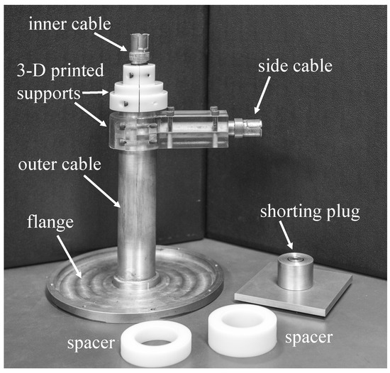 A prototype triaxial probe system was designed to operate in the band 0.75–3 GHz using mostly parts on hand. The inner and side cables were constructed using prefabricated General Radio (GR) airlines and were terminated in GR-874 50 connectors [27,28]. The diameter and tube thickness were identical to those in the simulations described in Section 4.5, and thus the characteristic impedance of these cables was slightly less than 50 . However, the length of the inner cable for the prototype was slightly longer at 235 mm to allow for attachment of the GR connector. The outer conductor of the outer cable was fabricated using standard brass tubing, again with dimensions given in Section 4.5. The inner cable was supported within the tube using thin Teflon spacers, with holes drilled to minimize reflections. The outer cable was soldered to a brass flange of radius mm and thickness 5 mm. The final fabricated prototype is shown in Figure 8, along with the shorting plug and its spacers.