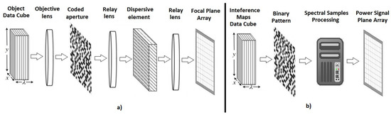 In CSI, the multispectral image is modeled as a data cube where are the spatial dimensions and L is the number of spectral bands. CSI measurements can be modeled as Equation (1) and the signal can be reconstructed by solving the optimization problem Equation (4). In this case, the sampling matrix corresponds to an optical system. For instance, CASSI system [12] is an architecture that attains CSI measurements, in three main steps: first encoding the information with a code aperture pattern, second using a prism as a dispersive element that shifts the spectral information and finally impinging in a focal plane array (FPA) detector. The process is shown in the Figure 1a.