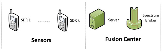 The global target is to make cooperative spectrum sensing, where several sensors send spectral power information to the Fusion Center, which processes the information with its two main components: a Server and a Spectral Manager. The Spectral Manager, commonly called Spectrum Broker (SB), is known in wireless networks as the device that controls and distributes spectral resources [17,18]. In our context, the sensors correspond to SDR, which can modify their own spectrum configuration, modulation scheme or transmission level power, and specially, they can measure the power spectrum values of a given frequency range.