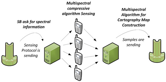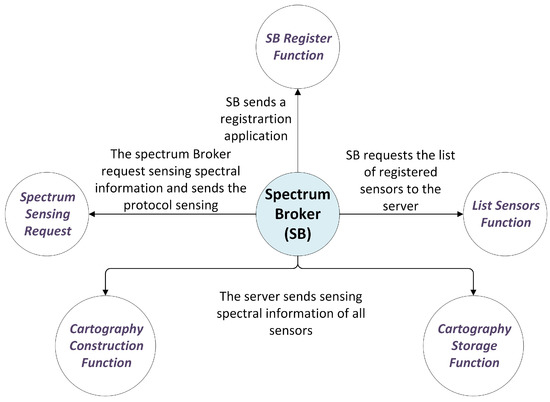 Finally, the five functions of the SB are shown in Figure 6. The SB register function allows the SB to be registered in the system. The List Sensors function let the Server to request the list of sensors assigned to its domain. In this way, the Server can design the sensing algorithms or the binary patterns, and generates reports. The Spectrum Sensing Request function allows the activation of the sensors, which sense the Spectrum and acquire the power samples. The Cartographic Construction function constructs the cartographic map. The last function, Cartography Storage, allows the system to store the IM.