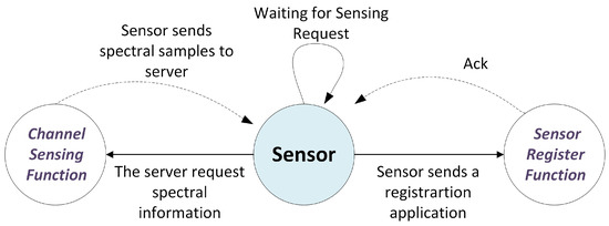 The functions of the sensors are shown in Figure 4 and correspond to channel sensing and sensor registering functions. The Sensor Registering Function is activated when a new sensor log into the system, so therefore the server has an updated list of all the sensors and their geographical location. The Channel Sensing Function is activated when the Fusion Center asks the sensors to send their spectral power values. It is important to emphasize that in this CSMC proposal, the sensors only acquire and send the values requested by the Fusion Center. Therefore, the server must send the specific code that defines which samples must be acquired together with the sensing request.