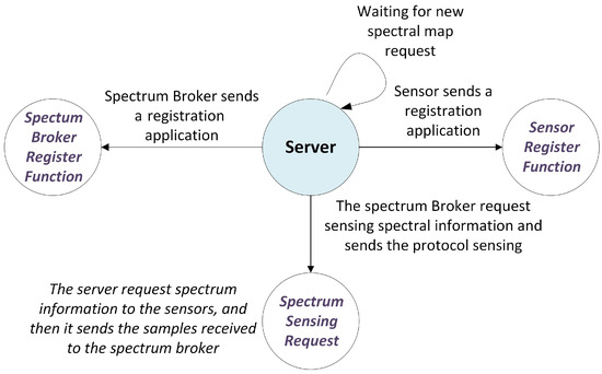 The functions related to the Server are shown in Figure 5. The Server has two main functions: serving as a bridge between the SDRs and the SB, and registering. There are two main registering functions: the SB register and the register of the sensors. The Server stores the list of sensors and Spectrum Brokers registered in the system. The advantage of being able to work with different Spectrum Brokers is that it allows the system to scale and work with different domains of sensors. For this reason, if there is more than one SB, the sub-system is called Spectrum Broker Domain (SBD).