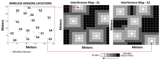 Once the signal is acquired by the SB, it performs a discretization process. Let be a vector with L frequency-domain samples, where , and . The SB can built L IM, that is, one interference map for each subchannel . In this work, each interference map corresponds to a frequency . Since there are J wireless smart devices connected, the SB builds an interference map based on the information of all the devices.