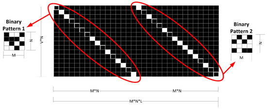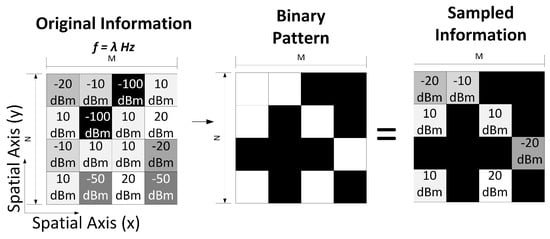 Let be a binary pattern matrix associated with the frequency band , where its elements are ones or zeros, and . Let be the 3D matrix with all 2D matrices. Each matrix should select the coordinates of that will be sampled by the SB, and which will be rejected. Specifically, we have a matrix where represents a transmissive element and represents a block element. Note that if , is sampled, and if , is rejected. Figure 9 shows an example of a binary pattern of 16 pixels that defines the samples to take in the spectral band. Note that the binary pattern discards 9 samples.