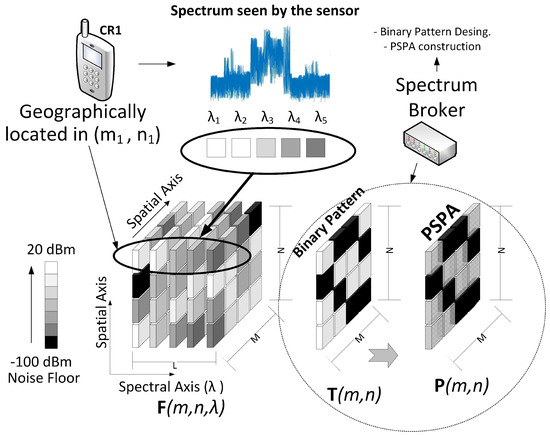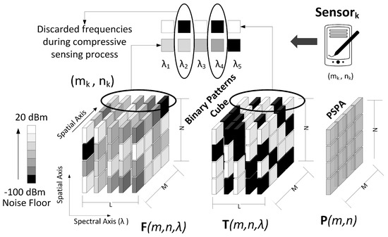 The data cube shown in Figure 8 is constructed using all samples of the spectral signals sent by the sensors, and knowing the values of all geographic points of the maps. However, in CSMC model only compressive samples in the frequency and spatial domains are used to construct the IM. In this sense, we propose the use of binary patterns that define which samples to take in each domain.