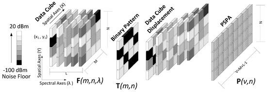 The first architecture is shown in Figure 11. In this case, }. For this reason, we can represent as a 2D matrix. In this architecture the power level information of several geographical points in all the bands is discarded, therefore, it is possible to have an ill-conditioning problem. In the second architecture, shown in Figure 12, }. This mean that is a 3D matrix. Finally, in order to get a closer analogy with the CASSI system, we propose Architecture 3 (Figure 13), where the PSPA is calculated by the linear combination of displaced data samples. In this case also corresponds to 2D matrix.