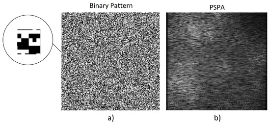 (a) Binary pattern used in the simulations; (b) Power Signal Plane Array (PSPA) calculated in the simulation.
