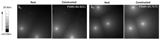 Figure 16 compares the ideal interference map with the interference map built for the spectral bands and . The interference map was built using the PSPA matrix and solving the optimization problem of Equation (10).