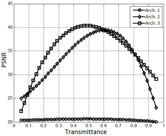 In order to compare the influence of the binary patterns transmittance values in the different architectures, we carried out a whole set of simulations. Figure 17 shows these results in terms of the Peak Signal to Noise Ratio (PSNR) for the ideal and constructed data cubes.