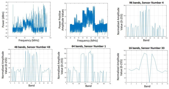 The experimental signal has power samples in dBm in the frequency domain. The signal was reduced to L frequency bands through a filter, where and . Figure 19 shows how the process goes from the experimental signal to the final signal reduced to and 16 frequency bands.