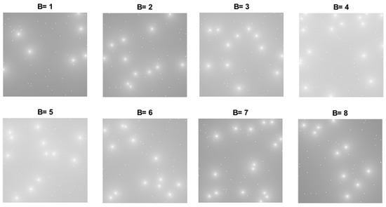 where N are the horizontal pixels and M the vertical pixels of . For example, means that the 20% of the binary pattern are transmissive and the remaining 80% are blocking. Figure 10 shows three binary patterns with different transmittance values. The binary patterns are constructed following the methodology used in [12], where the coded apertures are optimally designed using the restricted isometry property (RIP) to provide the optimization criteria.