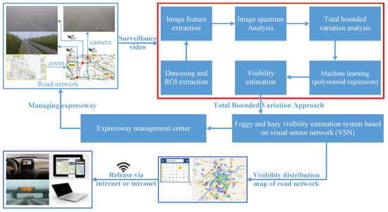 The structure of this paper is listed as follows. In Section 2, the related works are introduced. In Section 3, the definition of visibility is introduced and the application of the algorithm is then elaborated. Furthermore, the TBV approach is introduced in detail. Firstly, the image spectral feature of foggy and hazy images is discussed. Secondly, the rationality of TBV in characterizing the feature of foggy and hazy images is analyzed, and an innovative piecewise and stationary function is established. In Section 4 and Section 5, validated results for the algorithm are analyzed based on surveillance videos from Chinese expressways. Finally, conclusions are made.