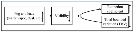 Heavy traffic accidents usually result from fog and haze. When visibility is less than 200 m, the traffic accident rate will surge [39]. To alleviate this problem, a total bounded variation approach to estimate foggy and hazy visibility was studied, and it focuses on the expressway visibility of less than 300 m. The conclusions are listed as follows:
