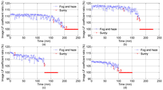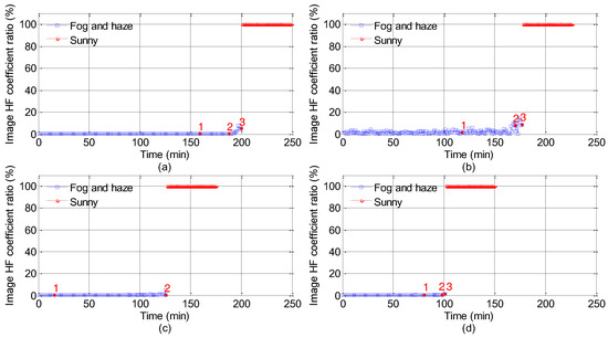 High frequency coefficient ratios ((Fr(n − 1, n − 1) = Fl(n − 1, n − 1)/Fh(n − 1, n − 1). The red numbers 1, 2 and 3 indicate 100 m, 200 m and 300 m, respectively. The upper limit visibility in road points 5 is 200 m, and so there is no red number 3 in (c). The ratio values shown in (a–d) are corresponding to the Points 2, 4, 5 and 6, respectively.).