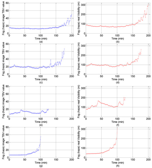 The varying trend comparison between TBV and real visibility can be seen in Figure 6. The left column of Figure 6 is the TBV varying trend of images during the foggy and hazy dissipation period, and the right column is the corresponding visibility. The data shown in Figure 6 correspond to road points 2, and 4–6 in Table 1. In reality, the TBV varying trend of images in road points 1, and 3 is identical with that of others. However, the data in road points 2, and 4–6, exclusively and obviously shown in Figure 6, are used as the testing set. Throughout the foggy and hazy disappearance process, the visibility varies from low to high levels, and there is fluctuation in a certain time interval. In general, the varying trend of TBV is completely consistent with the variation trend of foggy and hazy visibility.