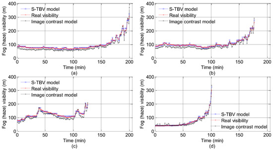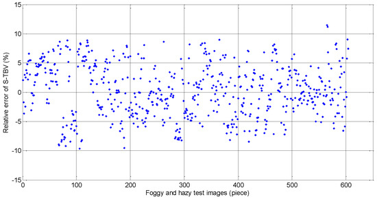 As mentioned above, the training set and the testing set are independent and the S-TBV model is validated. In Figure 9, the number of points with relative errors of less than 5% is 414, which accounts for 60% of the whole testing data. Only two data points have relative errors of more than 10%, i.e., 11.10% and 11.48%, respectively. The validated results meet and exceed the requirements shown in [39], where the estimated errors should be less than or equal to 10% when the visibility is less than 2000 m. In view of the validated data above, we can see clearly that TBV is closely linked to the features of fog and haze. A nonlinear relationship exists between TBV and real visibility, which can be analyzed by piecewise stationary theory. When visibility is less than 300 m, texture features of corresponding foggy and hazy images are apparent, and TBV is a well-designed parameter for characterizing such local differences among images. Furthermore, the piecewise stationary time series analysis theory is used for setting up the piecewise function between TBV and real visibility.