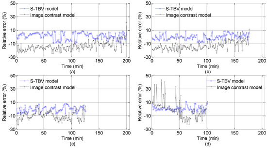 Relative errors comparison between the TBV approach and the image contrast model. (The image contrast model is based on [16] and the threshold 0.05 is used. The details about the relative error of the TBV approach are presented in Figure 9. The errors shown from in (a–d) are corresponding to the Points 2, 4, 5, and 6, respectively.)